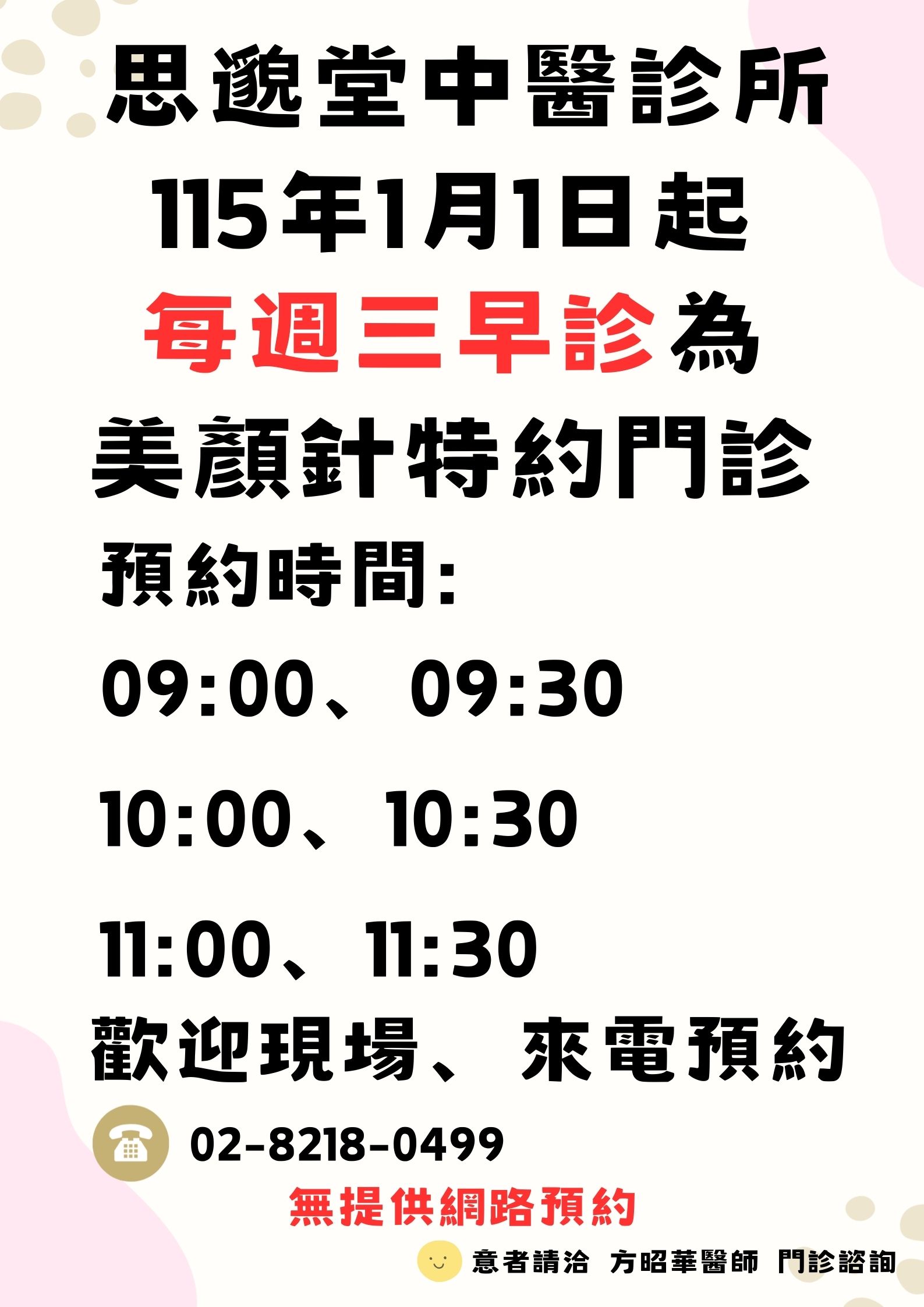 週三早診為美顏針特約門診-思邈堂中醫診所
